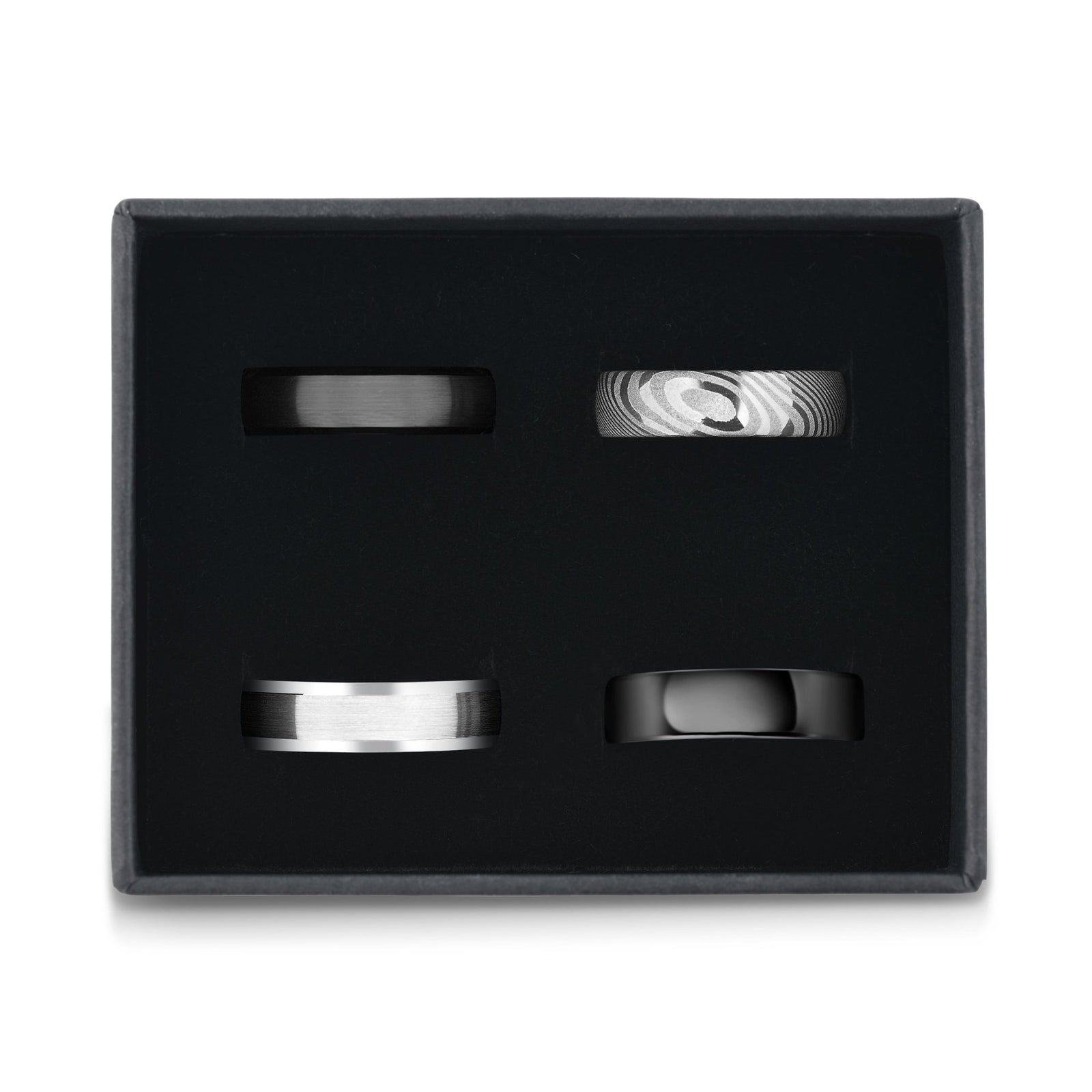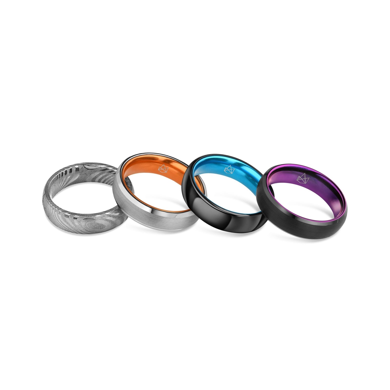 • Damascus steel acquires its wavy surface design by hammer-welding strips of steel and iron, followed by repeated heating and forging to create a beautiful, durable band. The ring is then acid finished, which can darken parts of the steel, as well as produce a raised texture to the surface. Each Damascus ring has a unique design, truly making it one-of-a-kind. No two rings are alike!