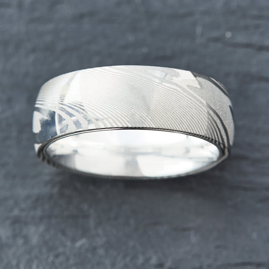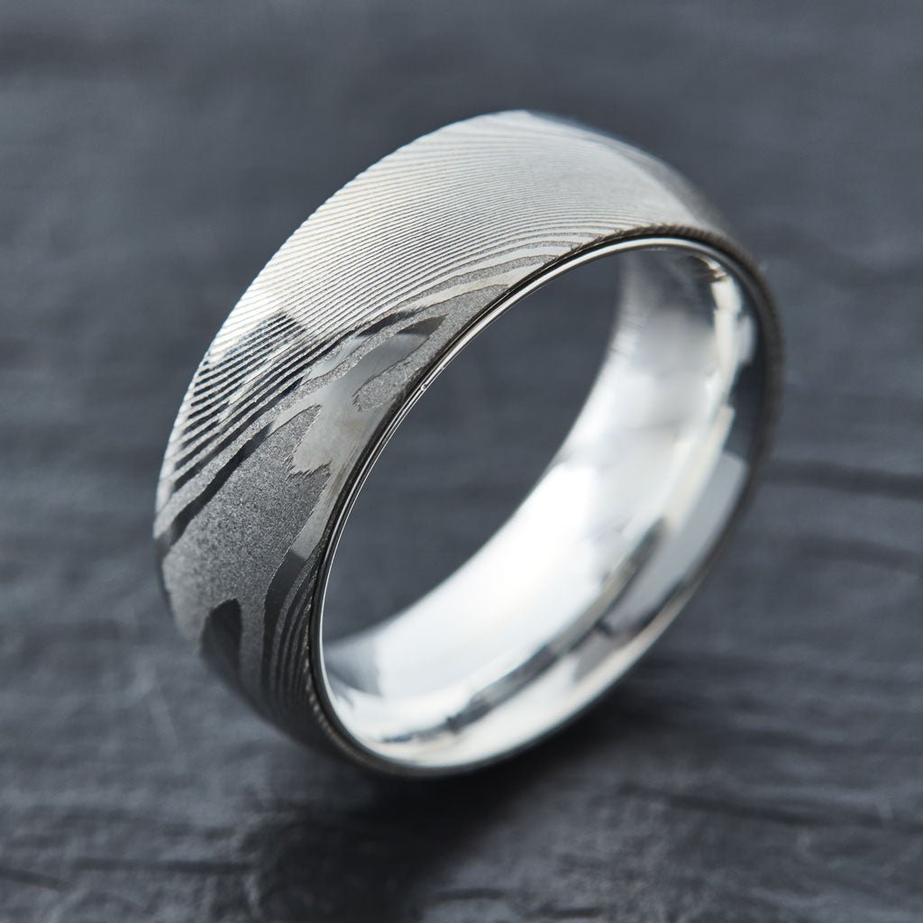 The process of creating a unique silver on silver wood grain begins with hand forging and folding two different types of steel numerous times at extreme heat and intense pressure. Our ring is then introduced into our signature light acid bath, slightly etching away parts of the steel, resulting in a beautiful silver on silver wood grain pattern unique to every ring. Finally, the ring is then polished to an exquisite high shine.