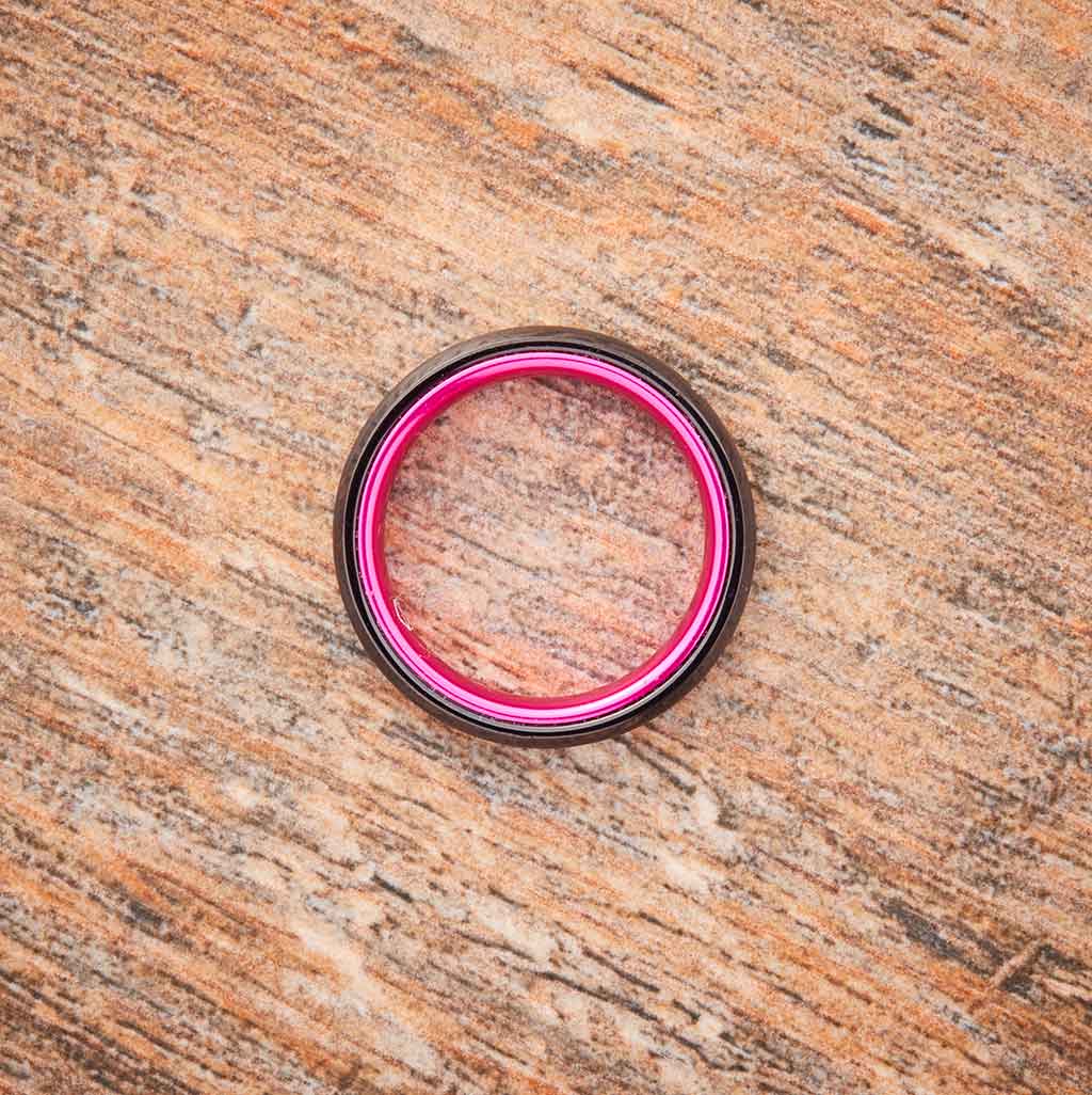 The process of creating the stunningly bright pink interior begins with a singularly piece of space grade aluminum which is then anodized with a protective oxide honeycomb layer. The ring is then introduced to a single component dye that is absorbed by a capillary effect to ensure maximum saturation of color, while actually becoming part of the ring's surface itself.