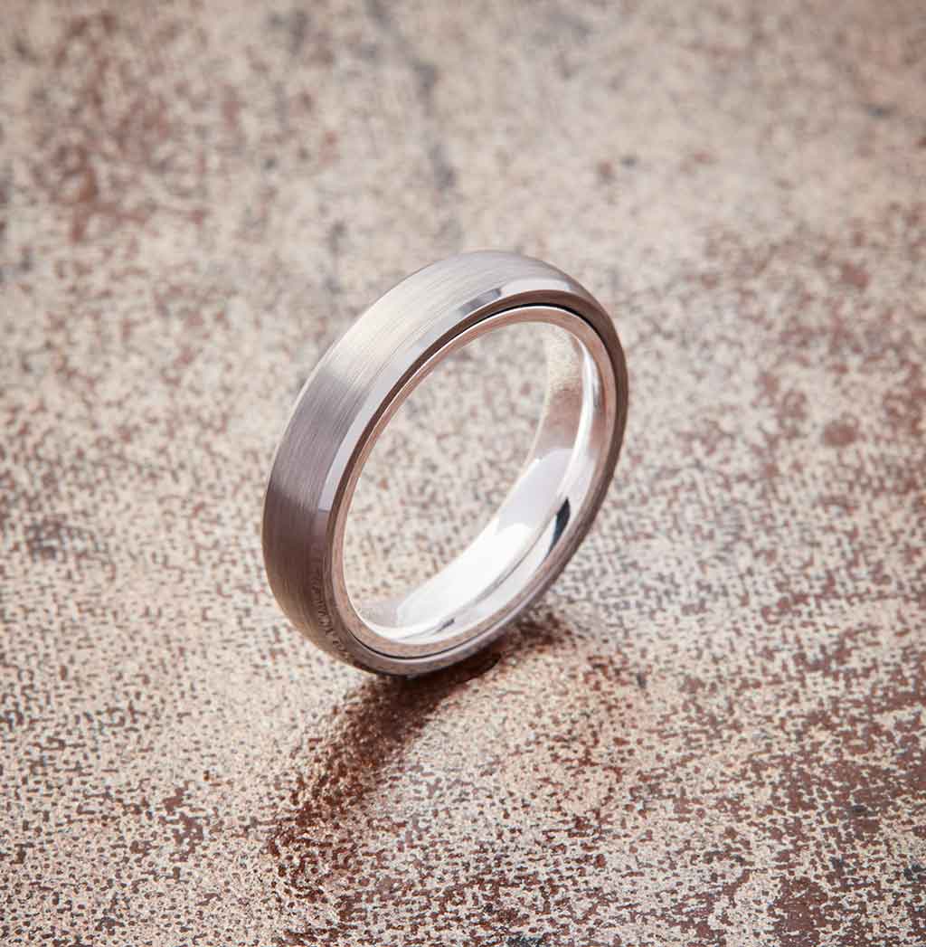 Tungsten Exterior: The EMBR silver tungsten band has been engineered to be as strong as it is strikingly beautiful. Its strength is unmatched. It is about ten times harder than 18K gold and about four times harder than titanium. Tungsten also holds its shape forever, meaning the ring will not bend or wear down, truly making it timeless in its function and design.