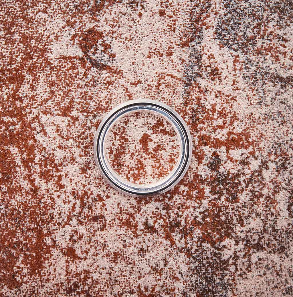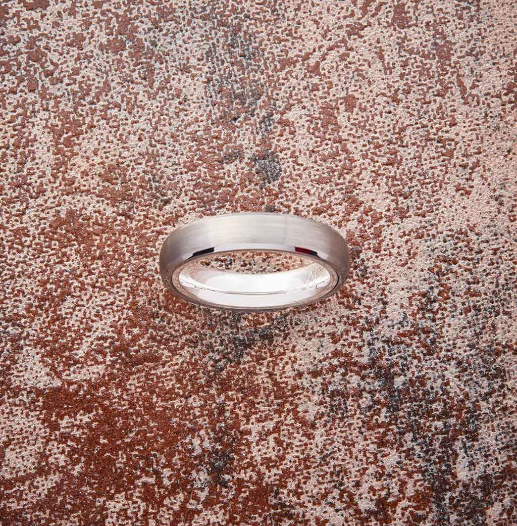 The process of creating the EMBR silver tungsten band begins with taking a high-strength tungsten powder that’s combined with carbon to achieve its amazing strength. Each ring is then compression molded, sintered and polished, resulting in a remarkably smooth surface and an exquisite shine.