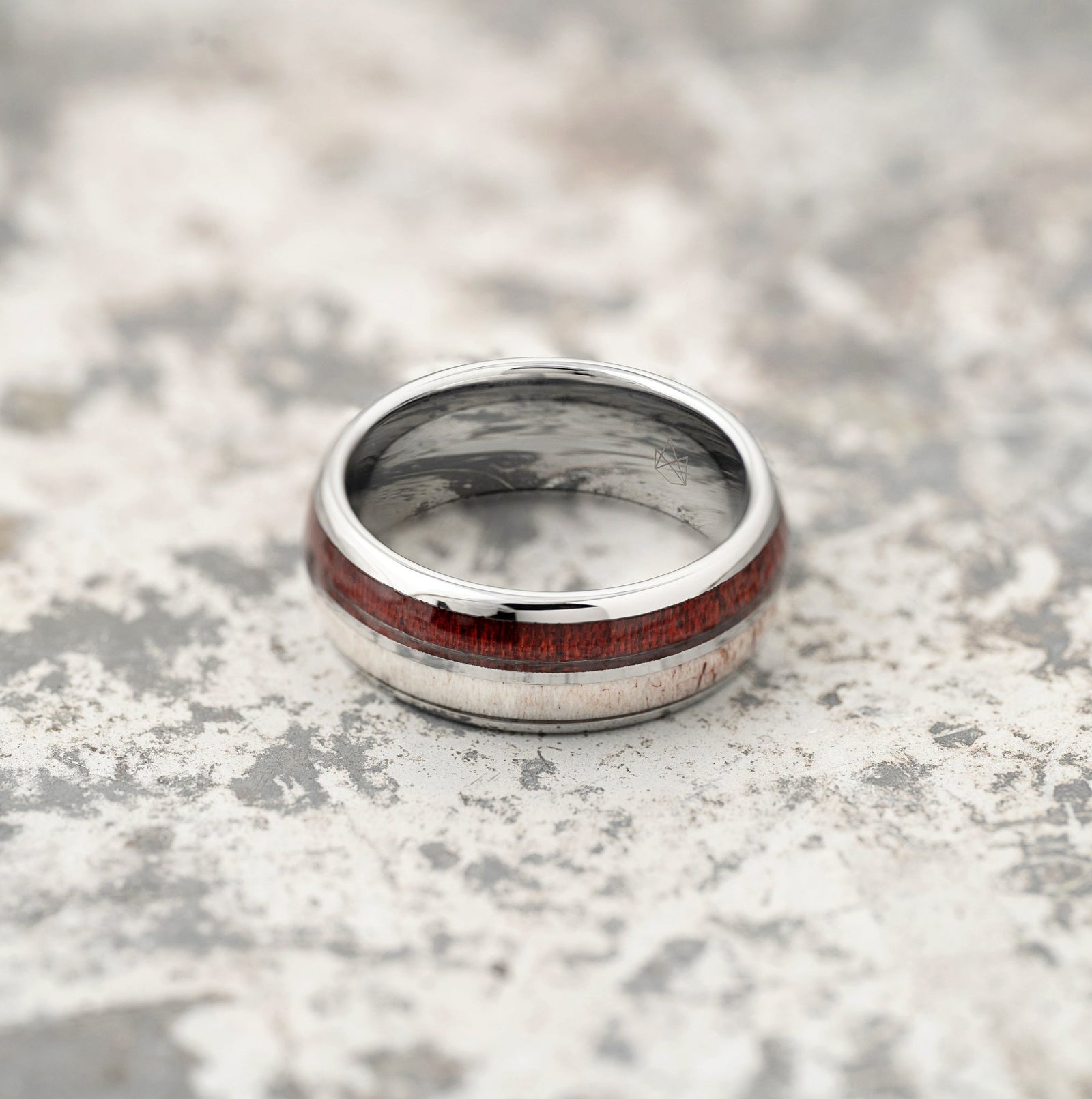 The process of creating the EMBR silver tungsten band begins with taking a high-strength tungsten powder that’s combined with carbon to achieve its amazing strength. Each ring is then compression molded and sintered, resulting in a remarkably smooth surface. The natural grain antler and Koa wood offer a beautiful blend of contrasting colors, making it the perfect statement piece.