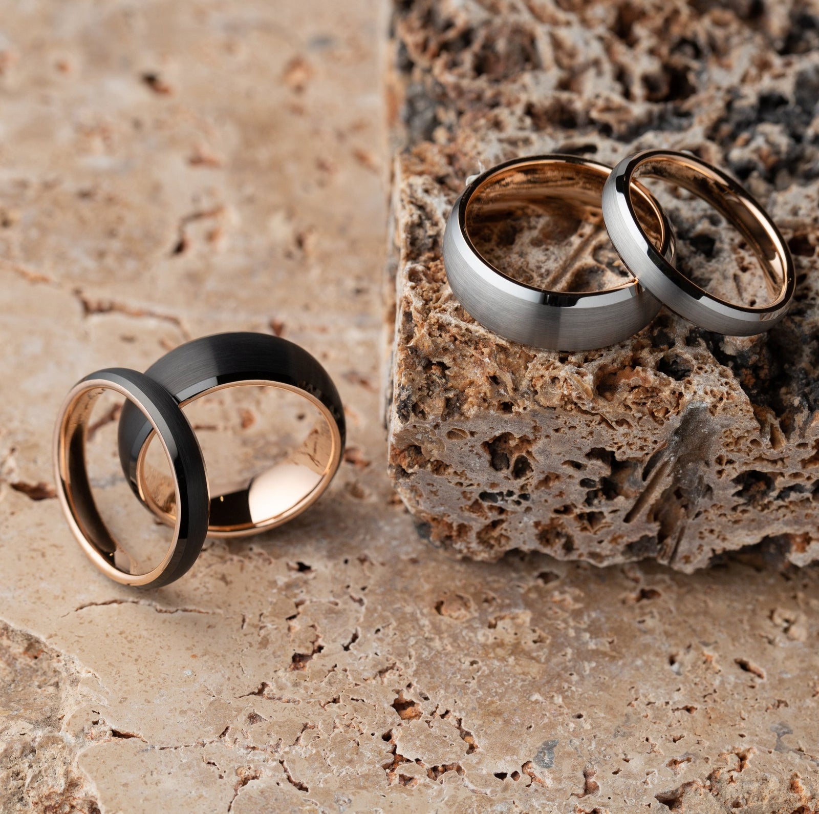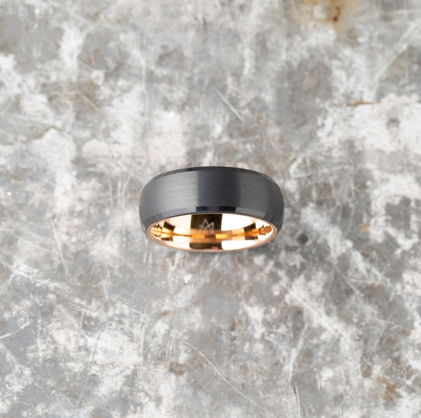The process of creating the EMBR black tungsten band begins with taking a high-strength tungsten powder that’s combined with carbon to achieve its amazing strength. Each ring is then compression molded, sintered and polished, resulting in a remarkably smooth surface and an exquisite shine. The rich, luxurious shade of black tungsten carbide results from a PVD process, which deposits thin layers of color in a high temperature, vacuum environment. This process permanently changes the exterior surface color of naturally gray tungsten carbide to a deep onyx black. The process is then used to produce the elegant Rose Gold coloring interior, creating a truly beautiful combination.