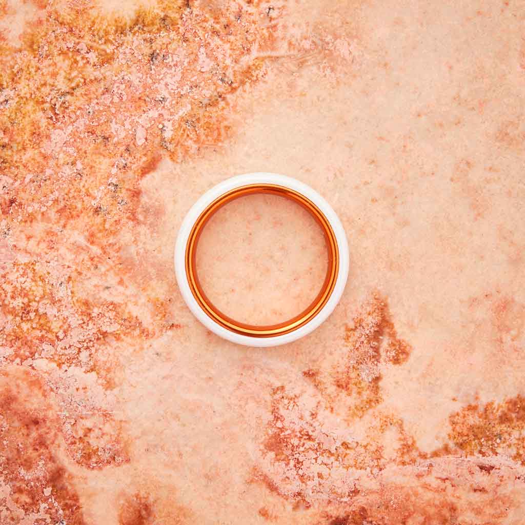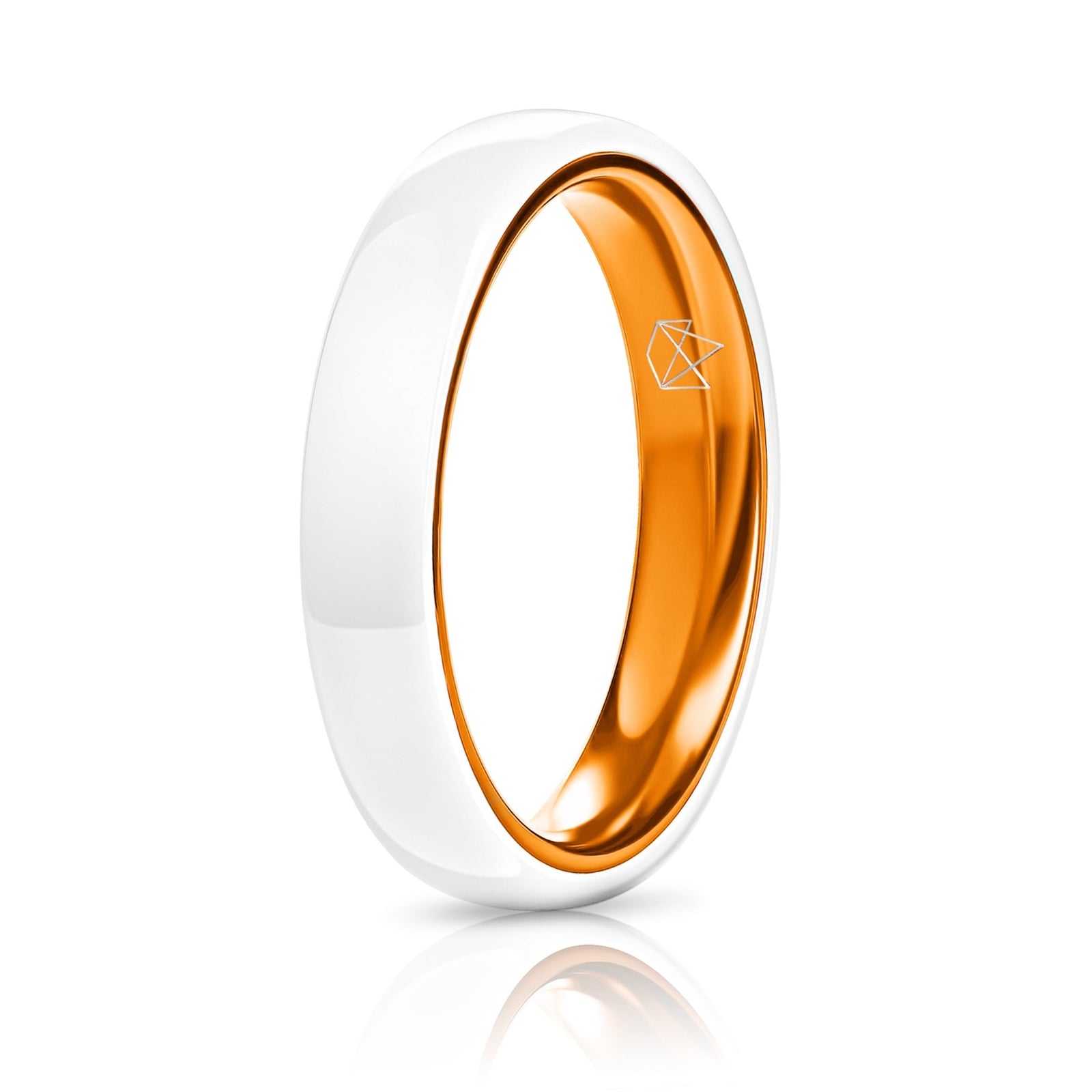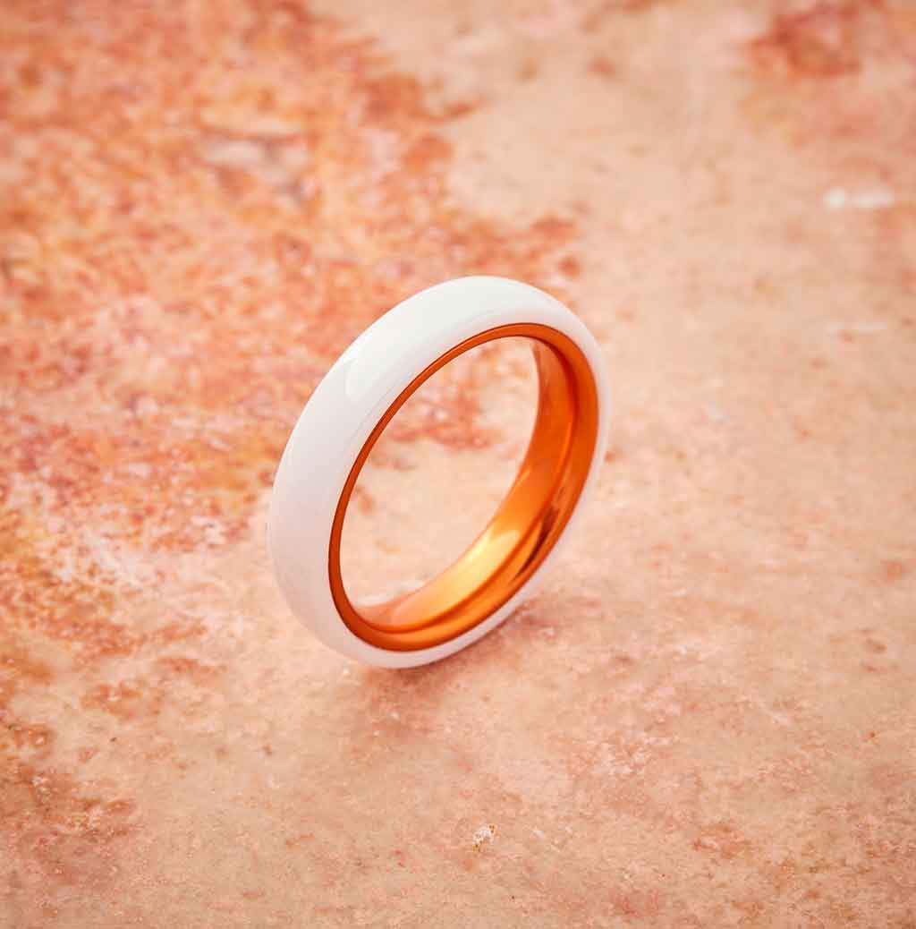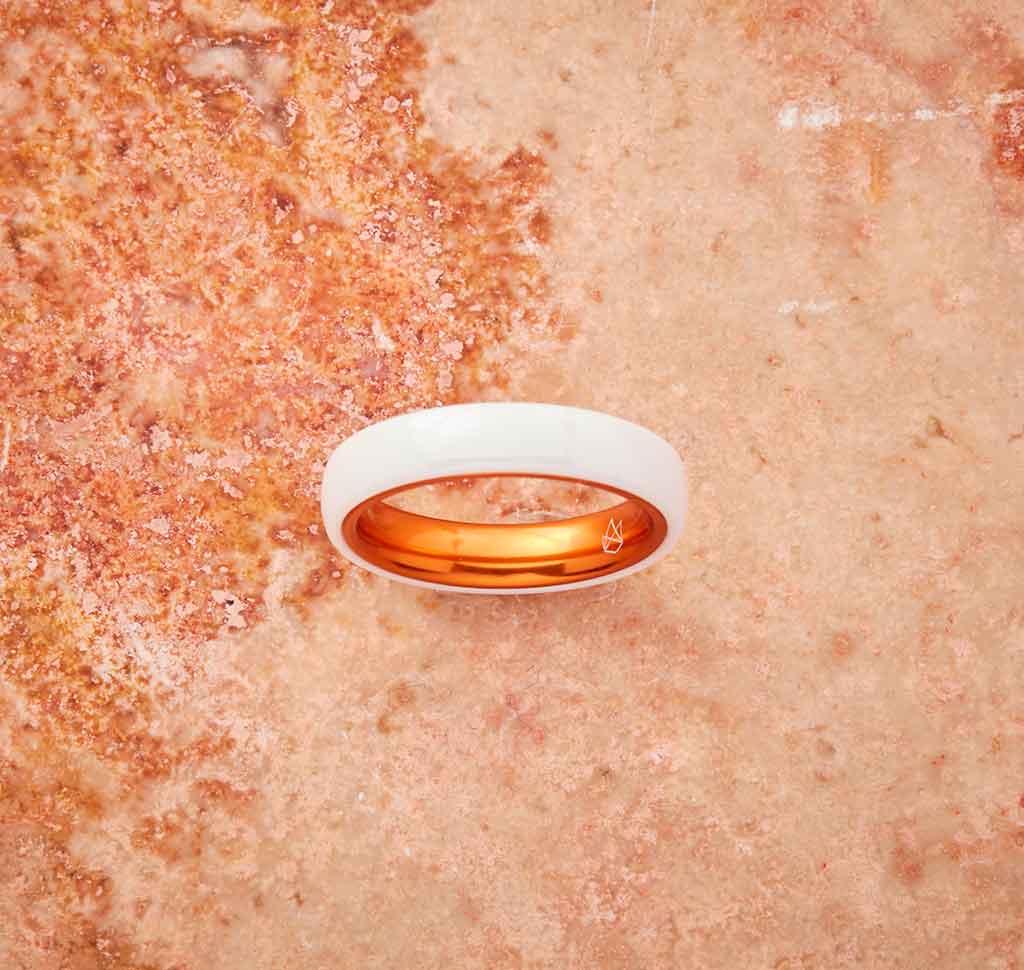 The process of creating the stunningly bright orange interior begins with a singularly piece of space grade aluminum which is then anodized with a protective oxide honeycomb layer. The ring is then introduced to a single component dye that is absorbed by a capillary effect to ensure maximum saturation of color, while actually becoming part of the ring's surface itself.