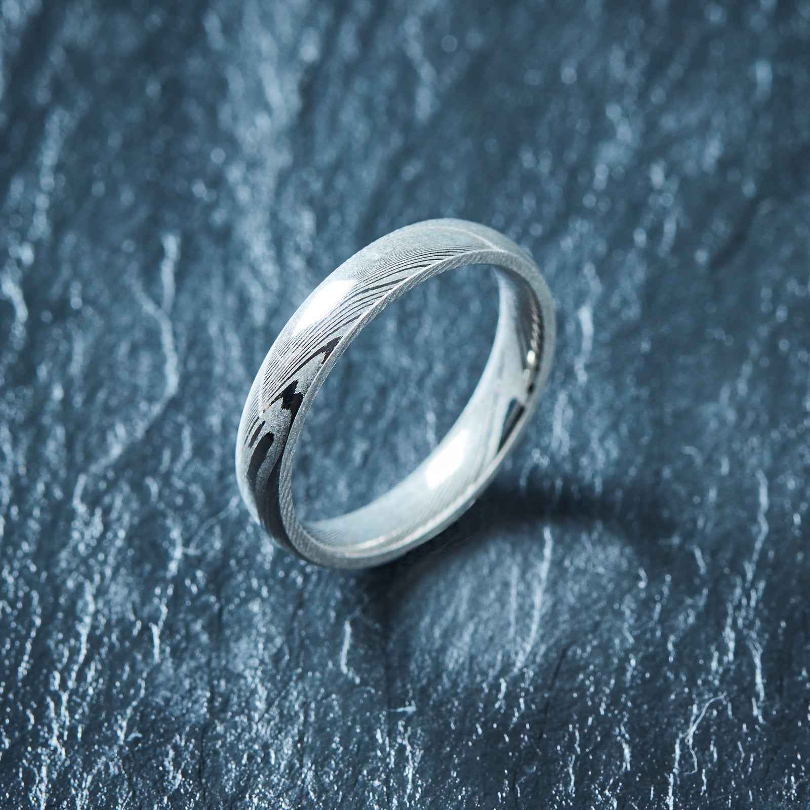 The process of creating a unique silver on silver wood grain design begins with hand forging and folding two different types of steel numerous times at extreme heat and intense pressure. Our ring is then introduced into our signature light acid bath, slightly etching away parts of the steel, resulting in a beautiful silver on silver wood grain pattern unique to every ring. Finally, the ring is then polished to an exquisite high shine.