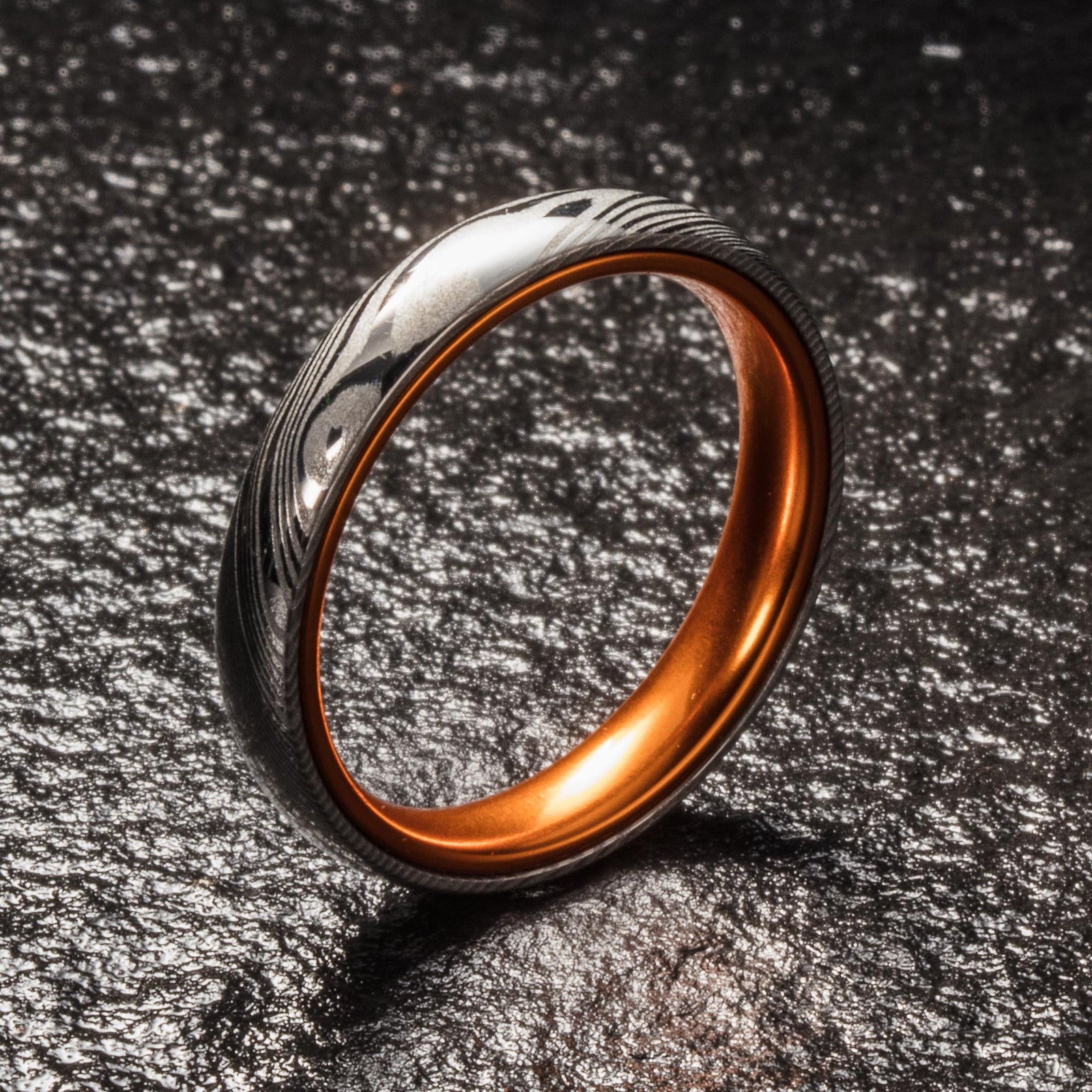 Damascus Exterior: The EMBR damascus band features a stunning wood grain pattern. Our signature light etch creates a beautifully strong, protective outer shell for its anodized interior that is both incredibly durable and timeless in its design. Each Damascus ring has a unique pattern, truly making it one-of-a-kind. No two rings are alike.