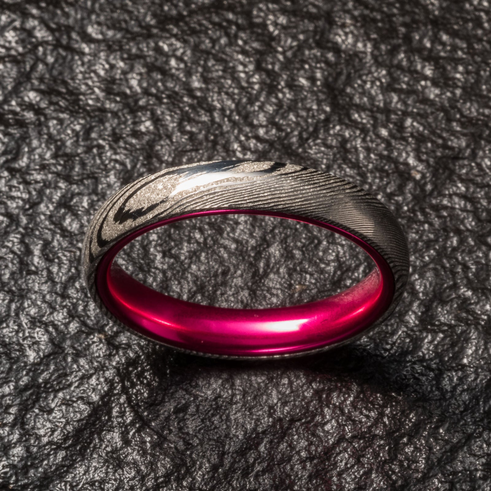 Damascus Exterior: The EMBR damascus band features a stunning wood grain pattern. Our signature light etch creates a beautifully strong, protective outer shell for its anodized interior that is both incredibly durable and timeless in its design. Each Damascus ring has a unique pattern, truly making it one-of-a-kind. No two rings are alike.